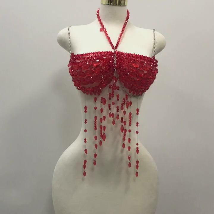 The Crimson Seduction Top is the embodiment of passion, luxury, and unapologetic confidence. Every crimson bead is hand-strung to sculpt your curves in a symphony of shimmer and fire. The cascading jewel strands glisten like liquid flame, catching light — and attention — with every move.